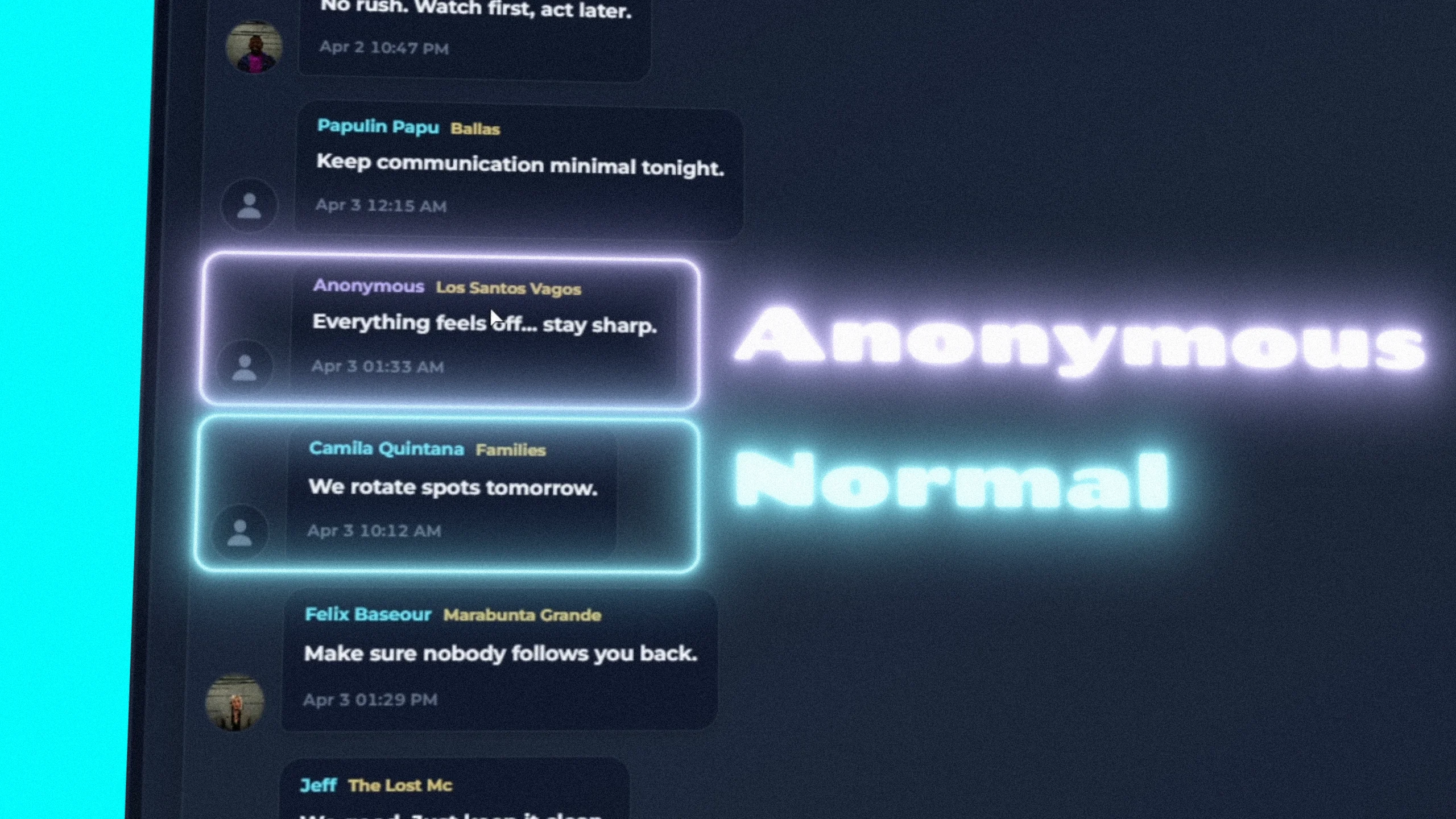 Communicate with other gangs using an integrated dark chat system. Send messages anonymously or reveal your identity, creating strategic and immersive interactions between criminal organizations.