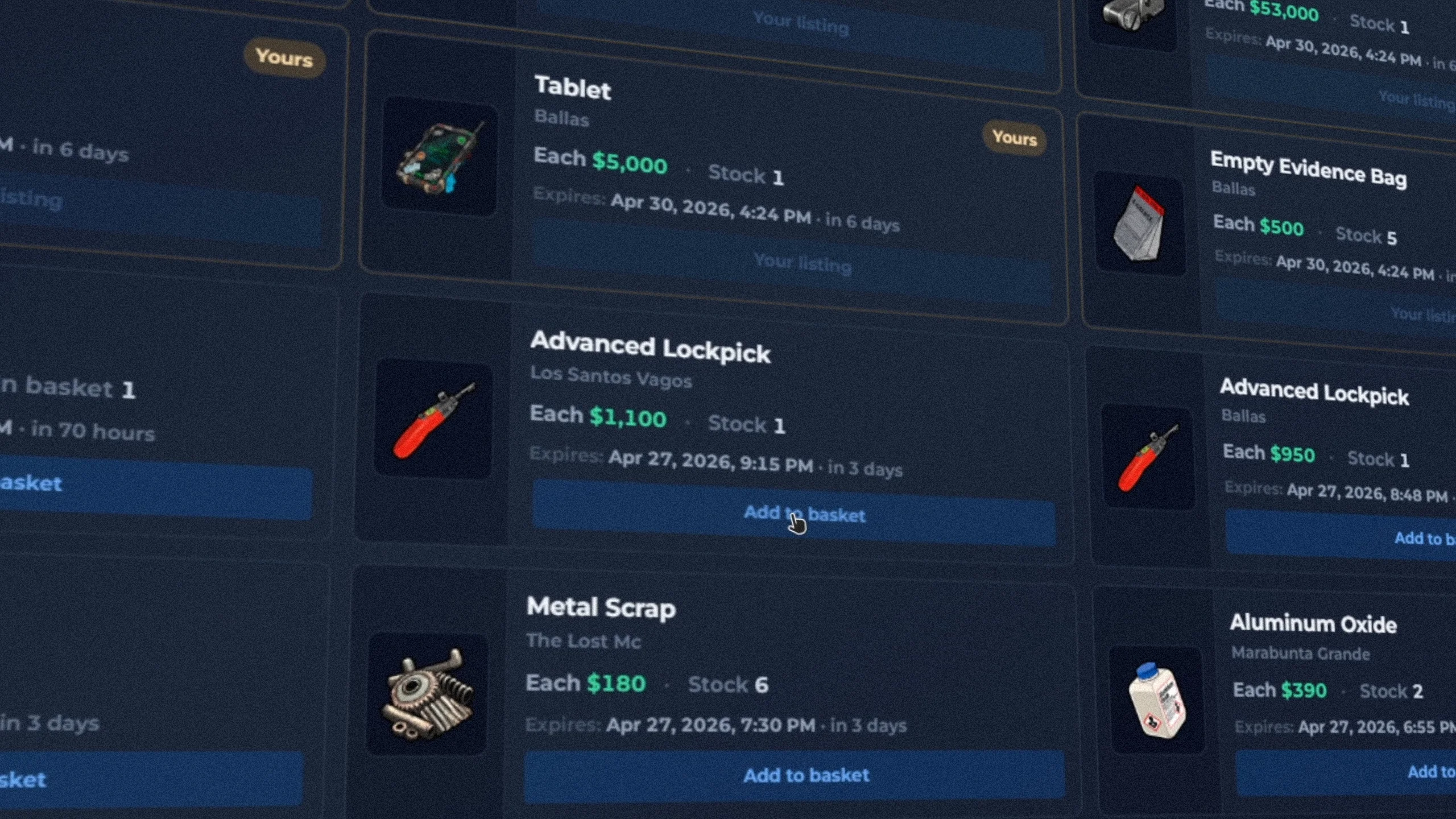 A global black market where gangs can trade illegal items across the entire server. Interact with other mafias, create deals, and generate black money, adding depth to the criminal economy and player interaction.
