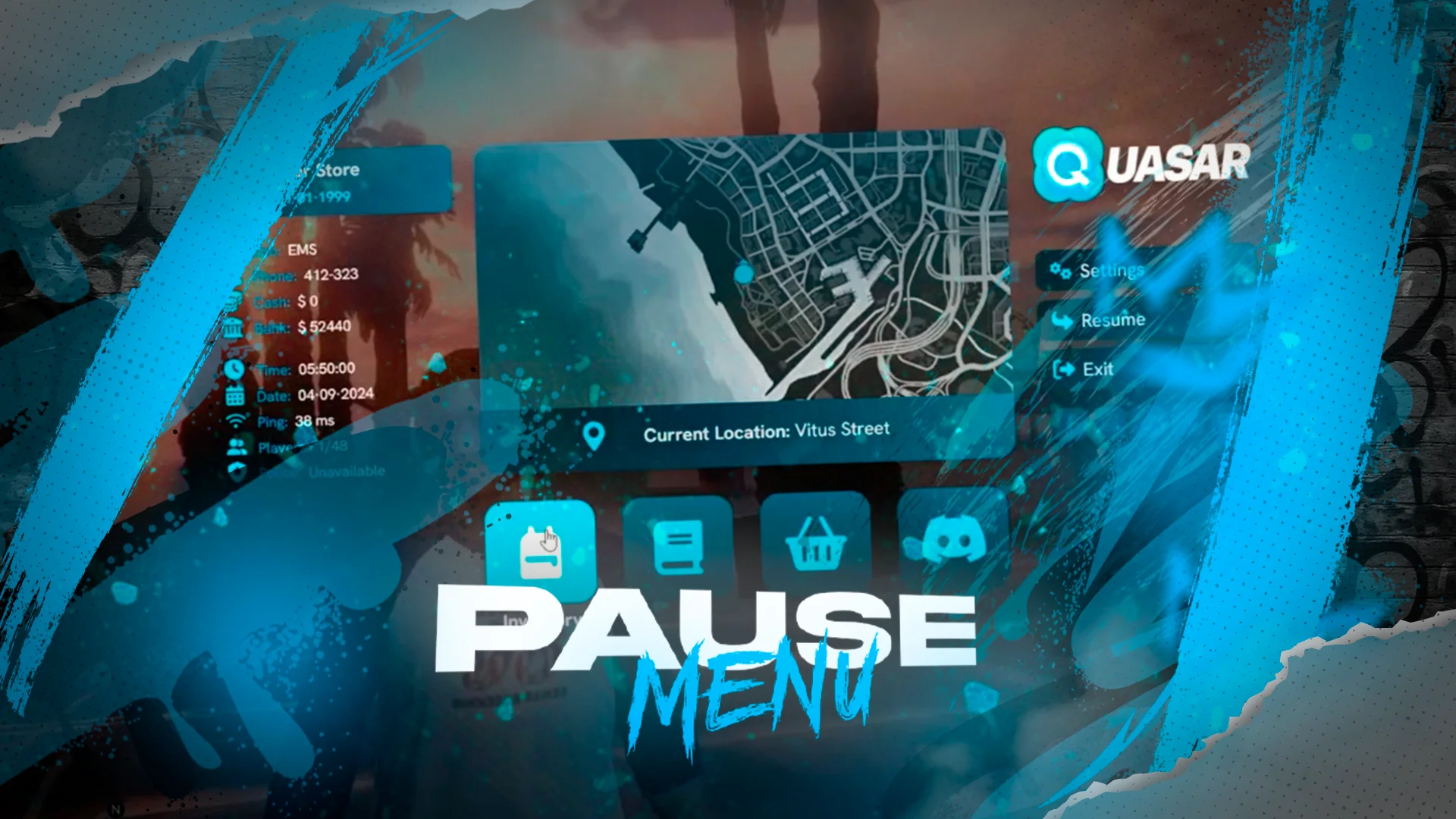 A fully customized pause interface showing money, job, uptime, ping, minimap, and social links. Completely brandable with themes, layouts, and server identity elements.