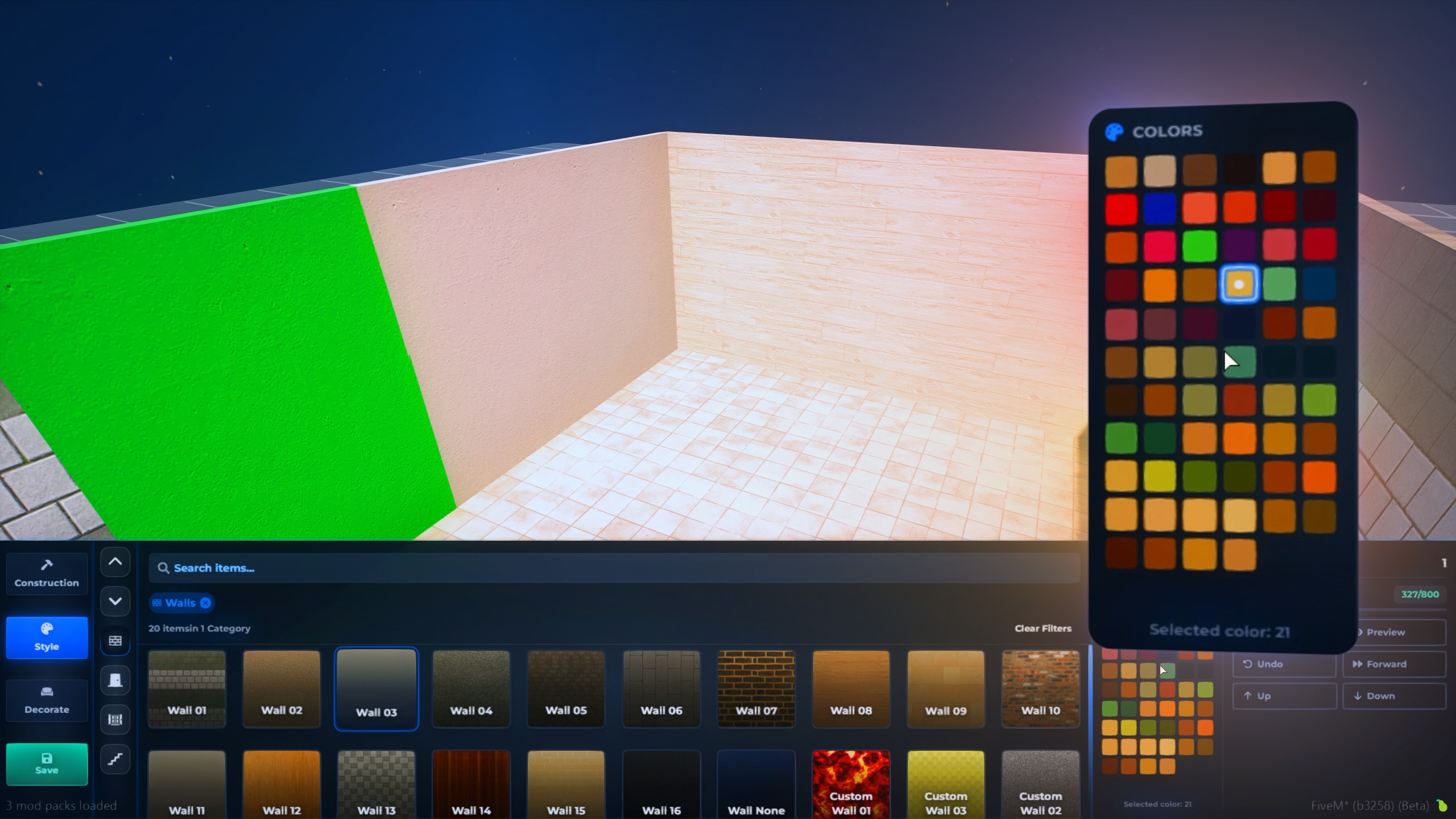 An advanced in-game system that lets you create custom interior shells visually, without any programming knowledge. Design unique interiors using hundreds of wall, ceiling, texture, and material combinations, preview them in real time, and save instantly. Perfect for expanding housing systems without buying external shells.